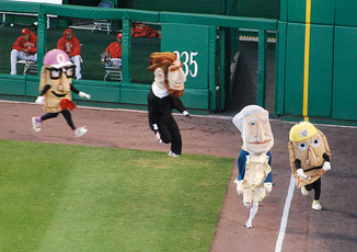 Pittsburgh Pirates baseball team organizes the so-called 'pierogi race' during their games. Four types of pierogi called Sauerkraut Saul, Cheese Chester, Jalapeno Hannah and Oliver Onion take part in the race. Well, these are four guys dressed up as pierogi. I have no idea, does it look appetizing? :) It's funny, to say the least. For sure it's a marketing campaign.
